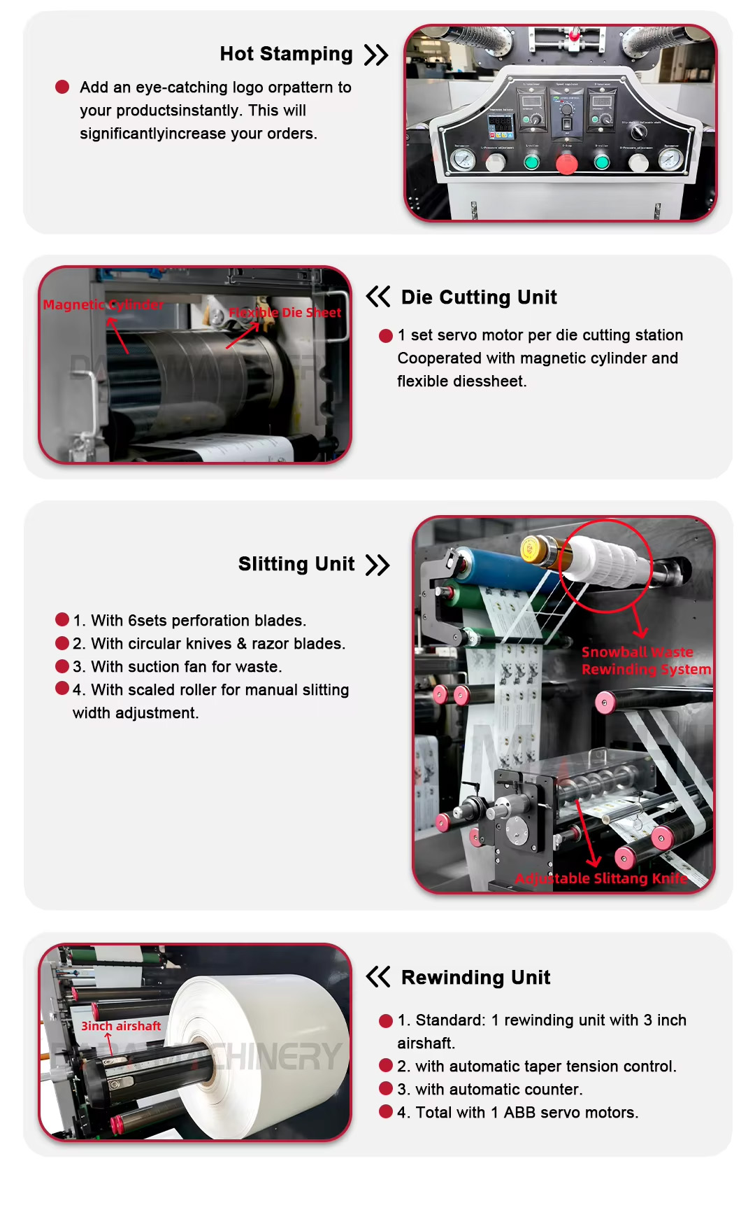 The whole machine using total 13pcs servo motor to gurantee stable running, it's intermittent model with flexo printing unit,  die cutting ahd slitting, ect.