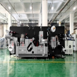 It has a flexographic printing, die-cutting, and slitting unit.