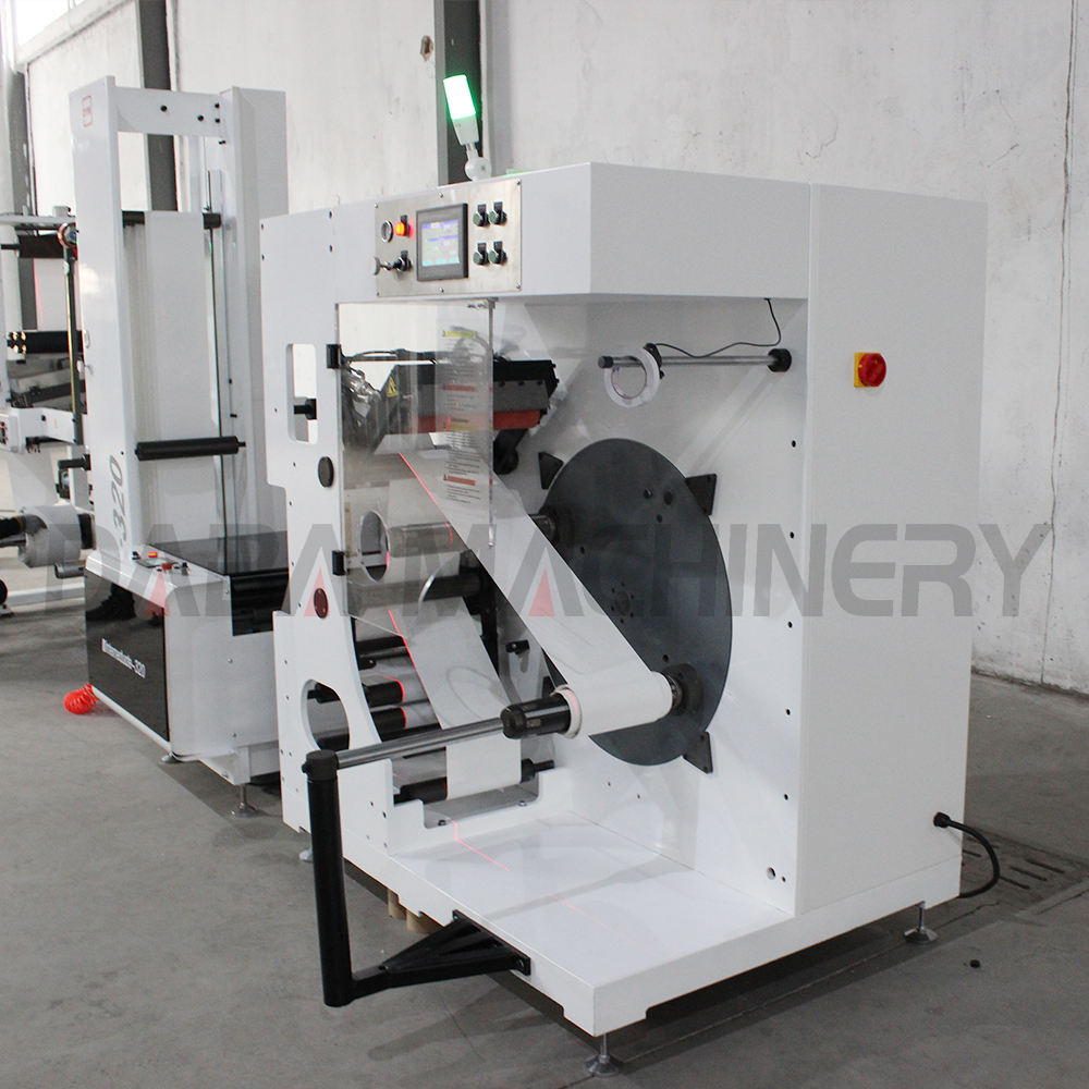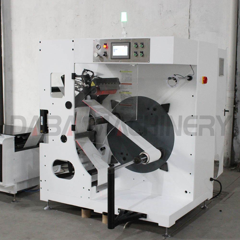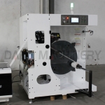 DABA SAC Automatic turret rewinder machine ensures non stop winding of web materials coming from printing and converting machinery. Non-stop production is achieved by automatic-ally severing the trailing end of the winding web and automatically attaching the leading edge to a prepared core. A unique Up and down round knife mechanism ensures a smooth straight cut-off no matter what material is being processed. Floor contact and contamination of the finished rolls is eliminated.
