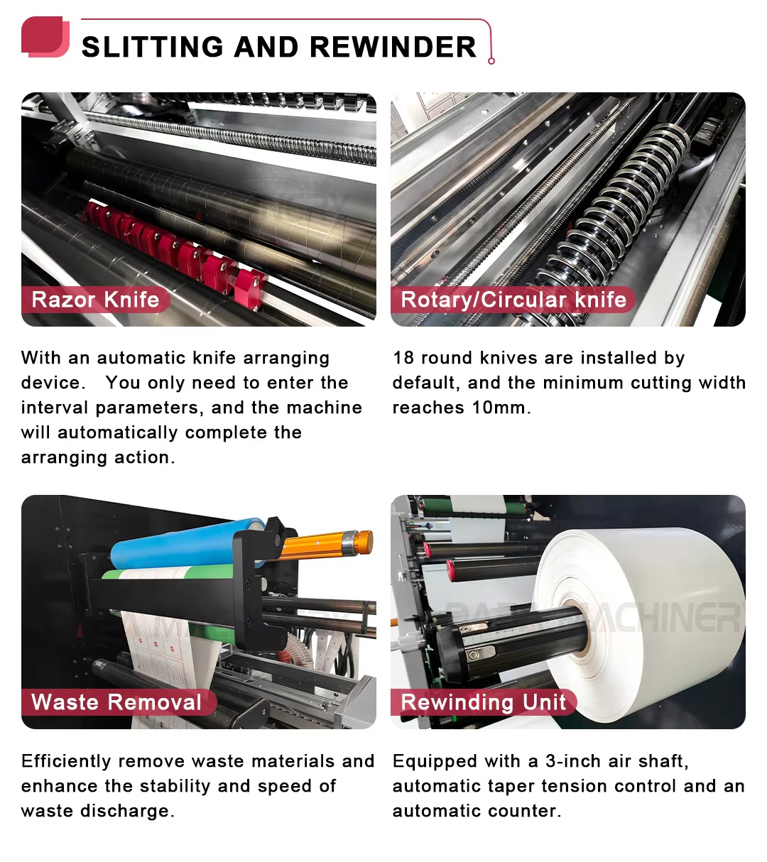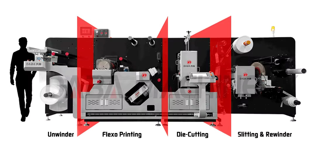 It has a flexographic printing, die-cutting, and slitting unit.