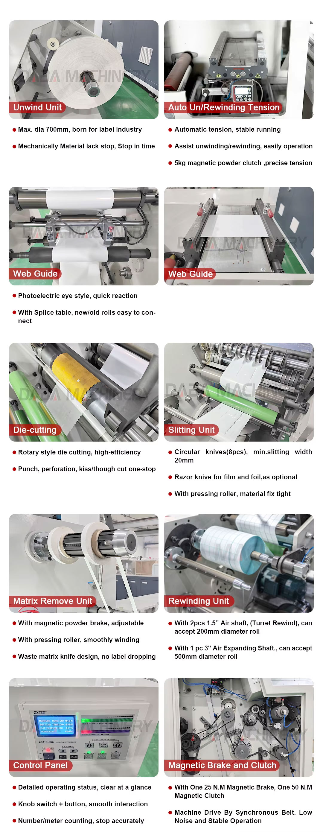 This machine has the characteristic of compact structure, fast speed, high efficiency, easy operation, accurate slitting and stably running and so on features.It is an ideal machine for cutting blank labels.