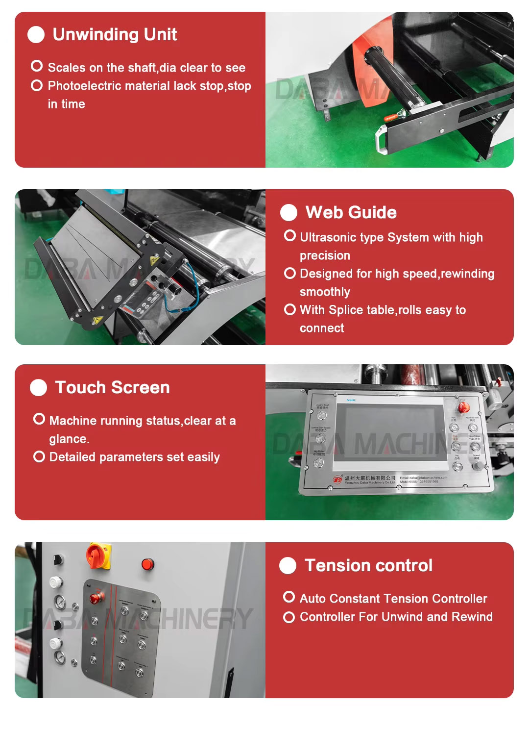 2. The tension control of unwinding unit and rewinding unit is adopt automatic tension control system; the control modes are tension feedback control and taper control.