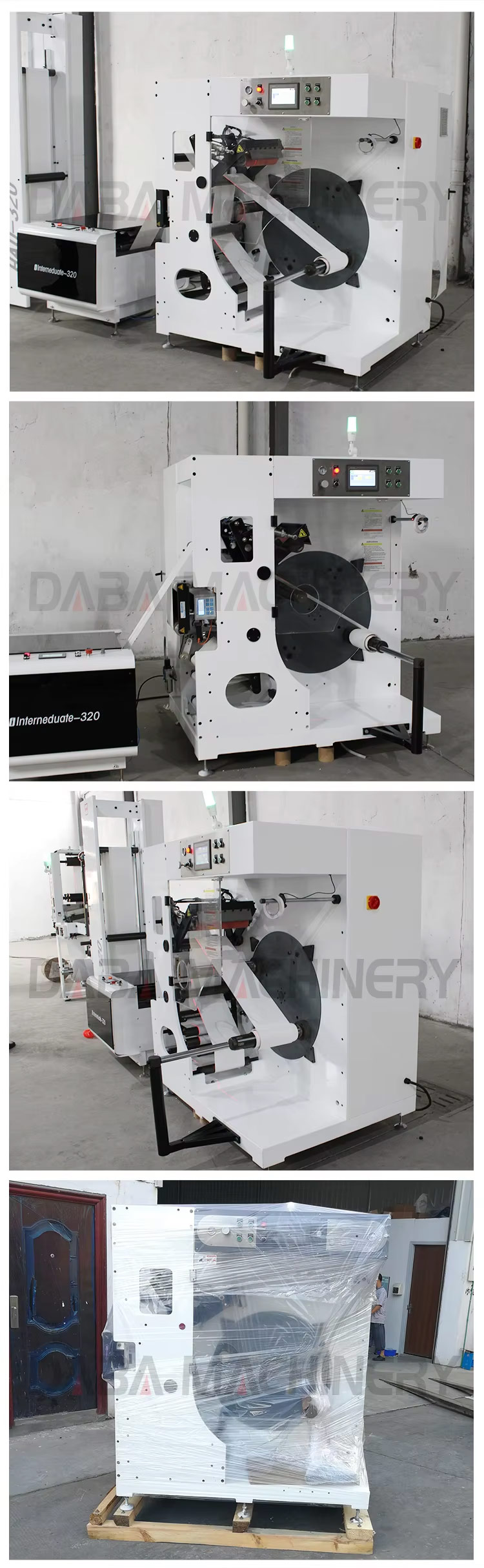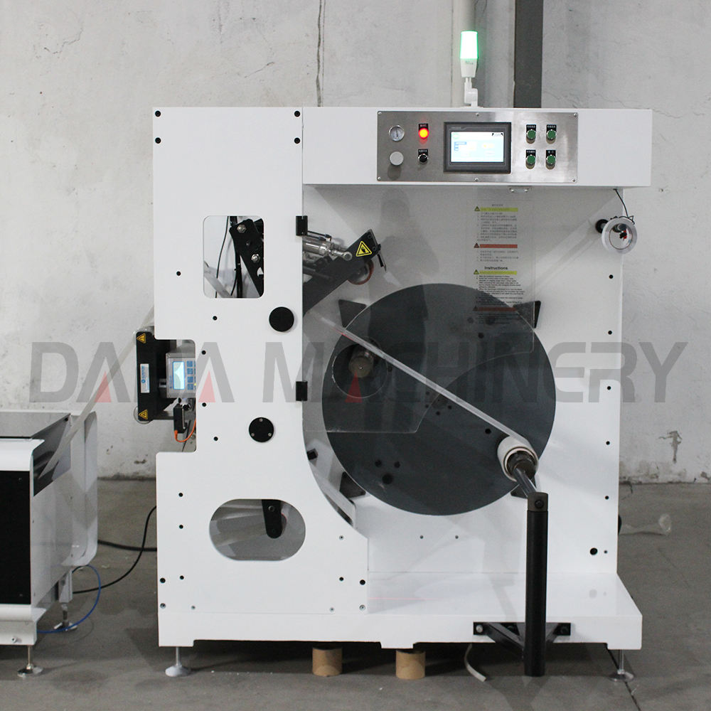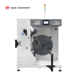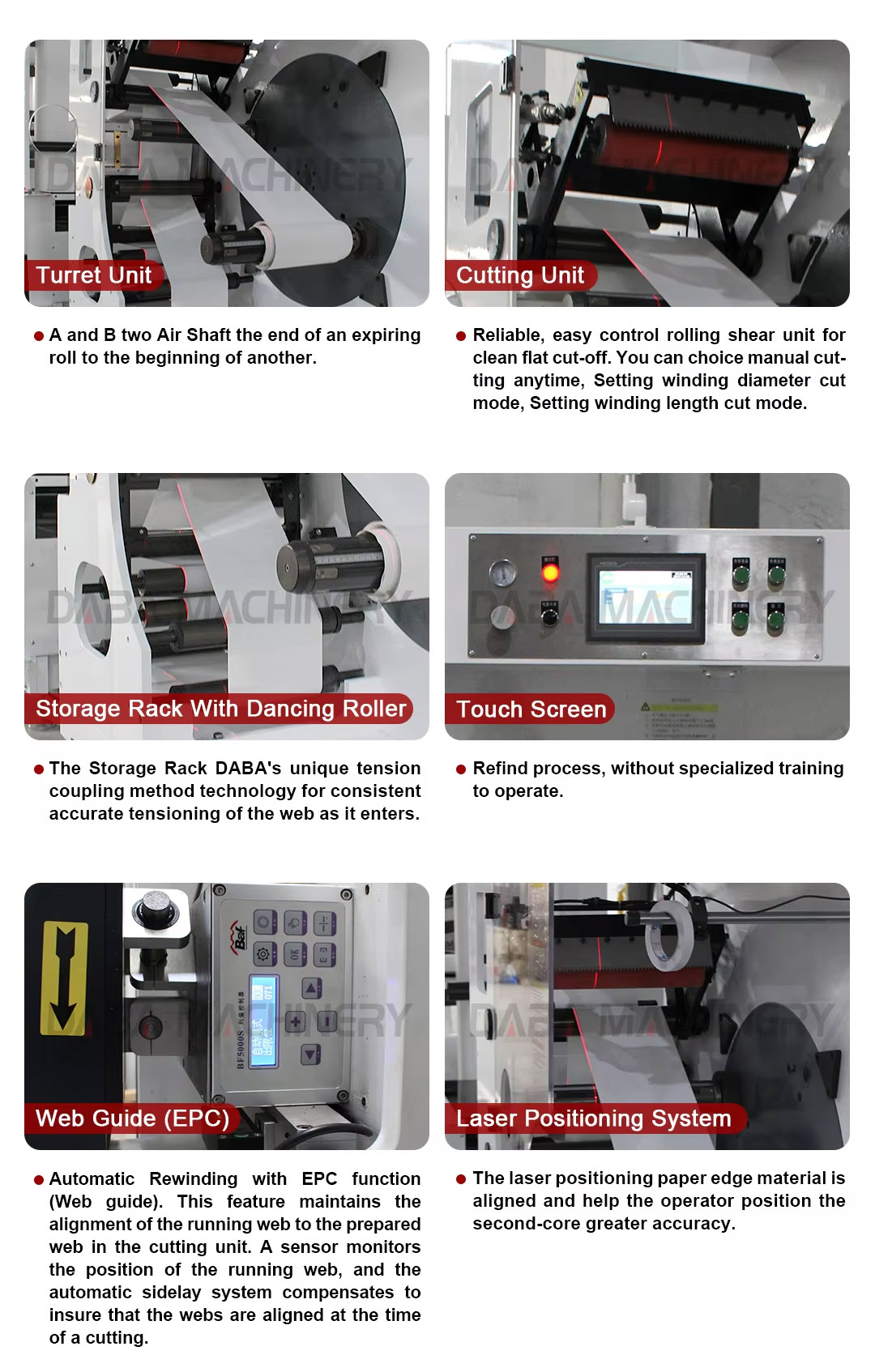 DABA SAC Automatic turret rewinder machine ensures non stop winding of web materials coming from printing and converting machinery. Non-stop production is achieved by automatic-ally severing the trailing end of the winding web and automatically attaching the leading edge to a prepared core. A unique Up and down round knife mechanism ensures a smooth straight cut-off no matter what material is being processed. Floor contact and contamination of the finished rolls is eliminated.
